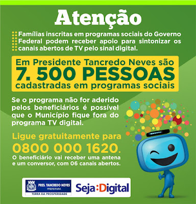 Famílias inscritas em programas sociais do Governo Federal podem receber apoio para sintonizar os canais abertos de TV pelo sinal digital.